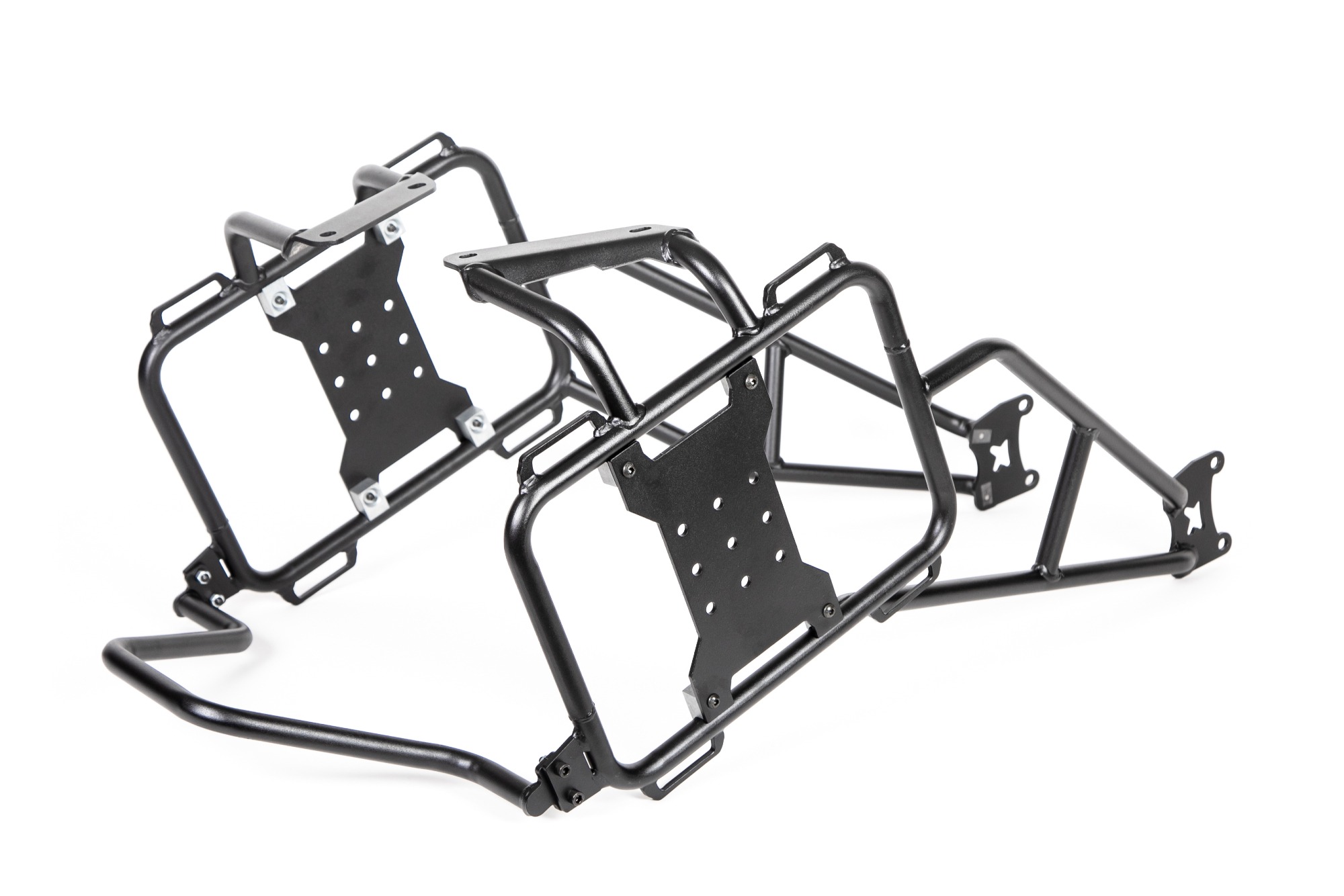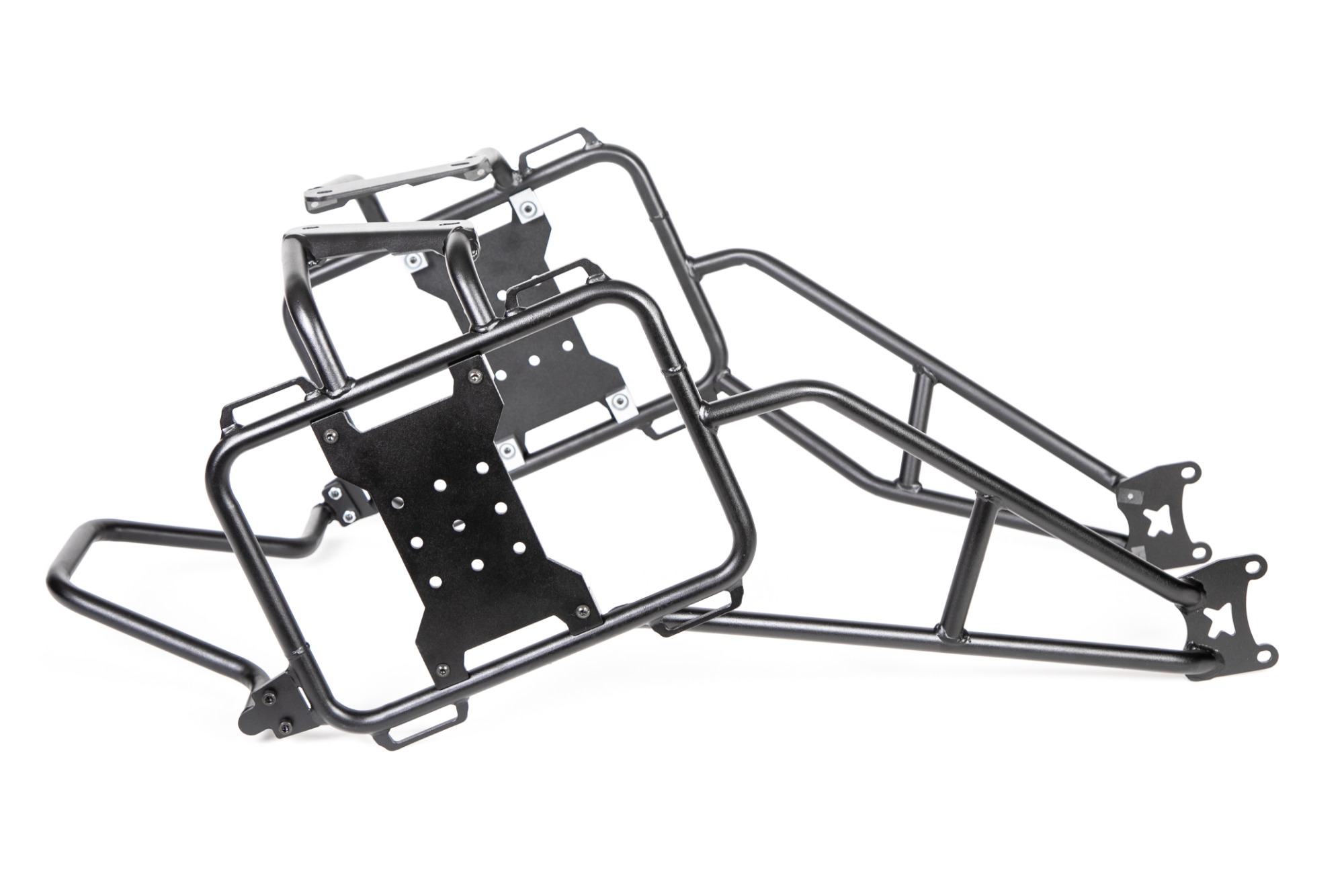Designed by Adventure Moto Australia and manufactured by Outback Motortek. The new X-Frames are the most universal and functional side pannier frames yet, allowing simple, secure mounting of Rotopax, hard panniers and soft luggage.