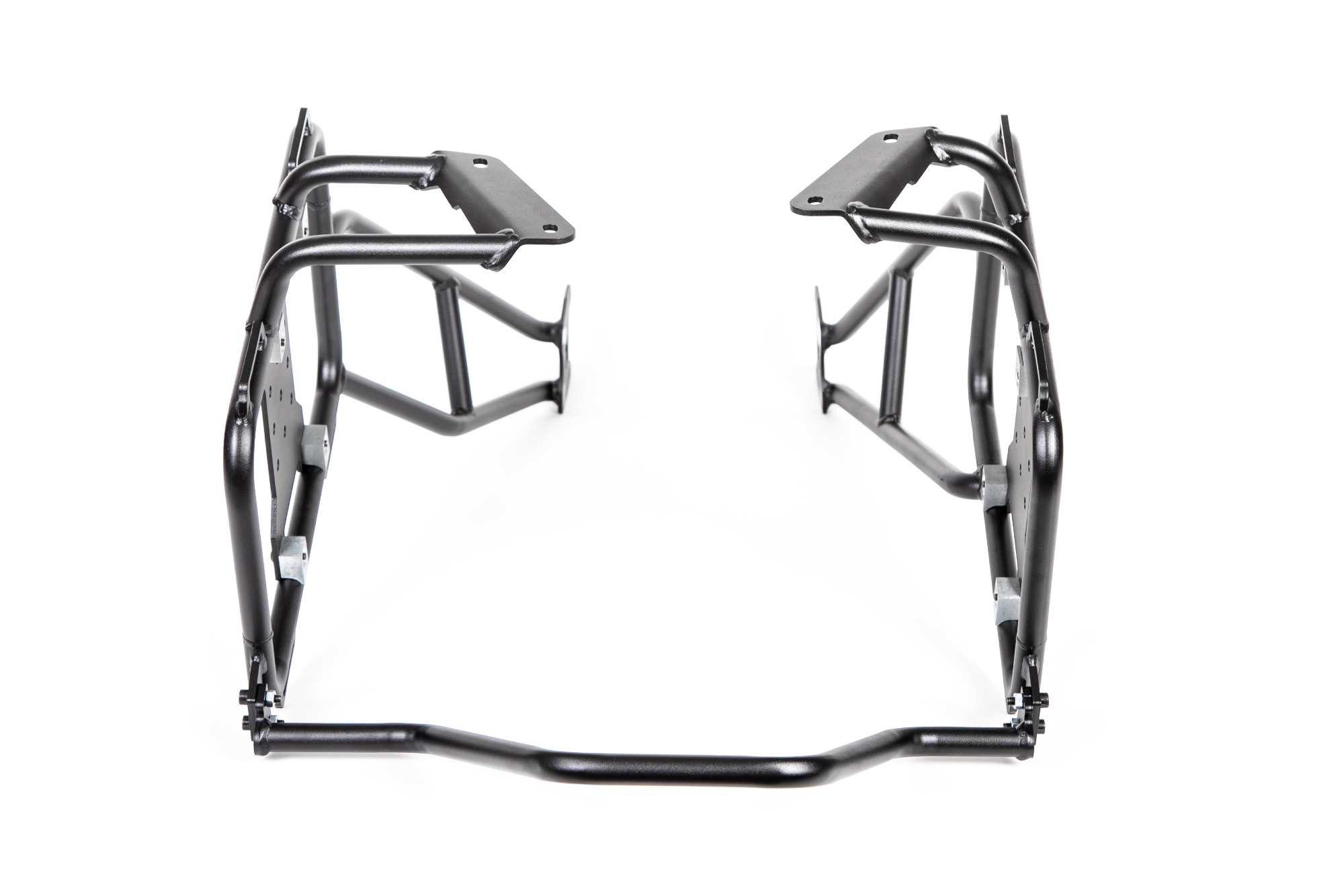 Matte black powder coated mild steel frames with an alloy X-bracket with multiple Rotopax mounting positions for custom weight distribution, as well as multiple tie-down points. You can even remove the X-Bracket from your frames when running Hard Luggage to reduce the frame weight.