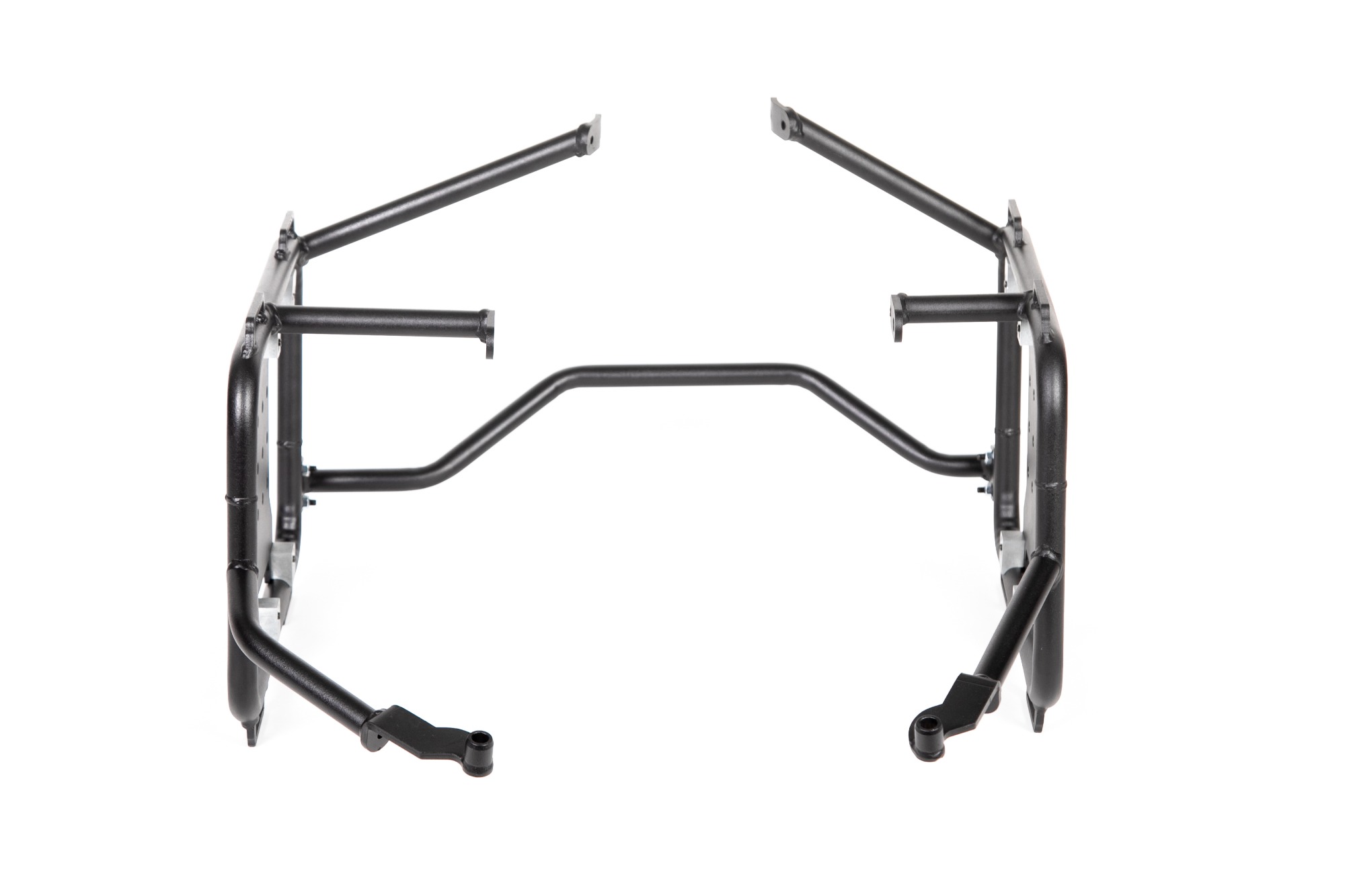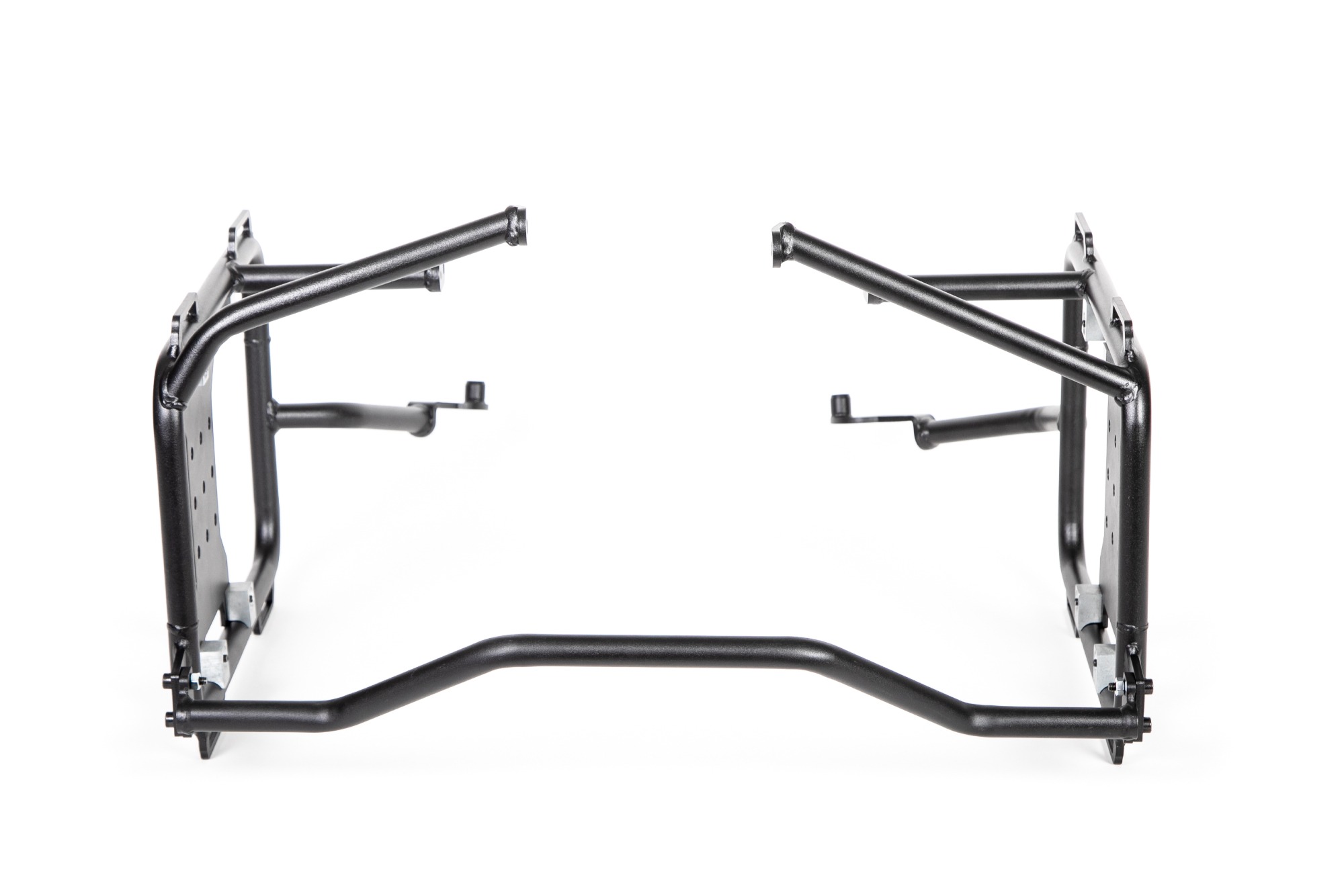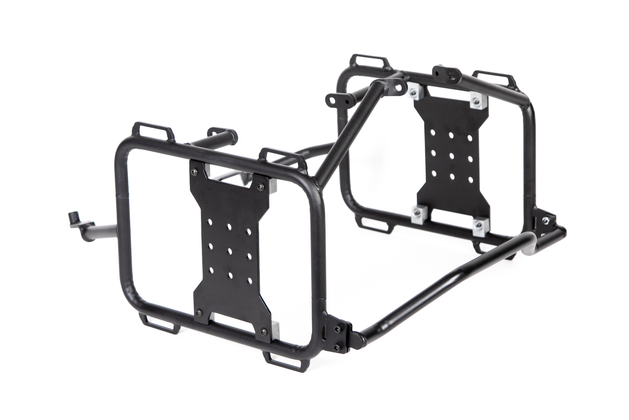 Matte black powder coated mild steel frames with an alloy X-bracket with multiple Rotopax mounting positions for custom weight distribution, as well as multiple tie-down points. You can even remove the X-Bracket from your frames when running Hard Luggage to reduce the frame weight.